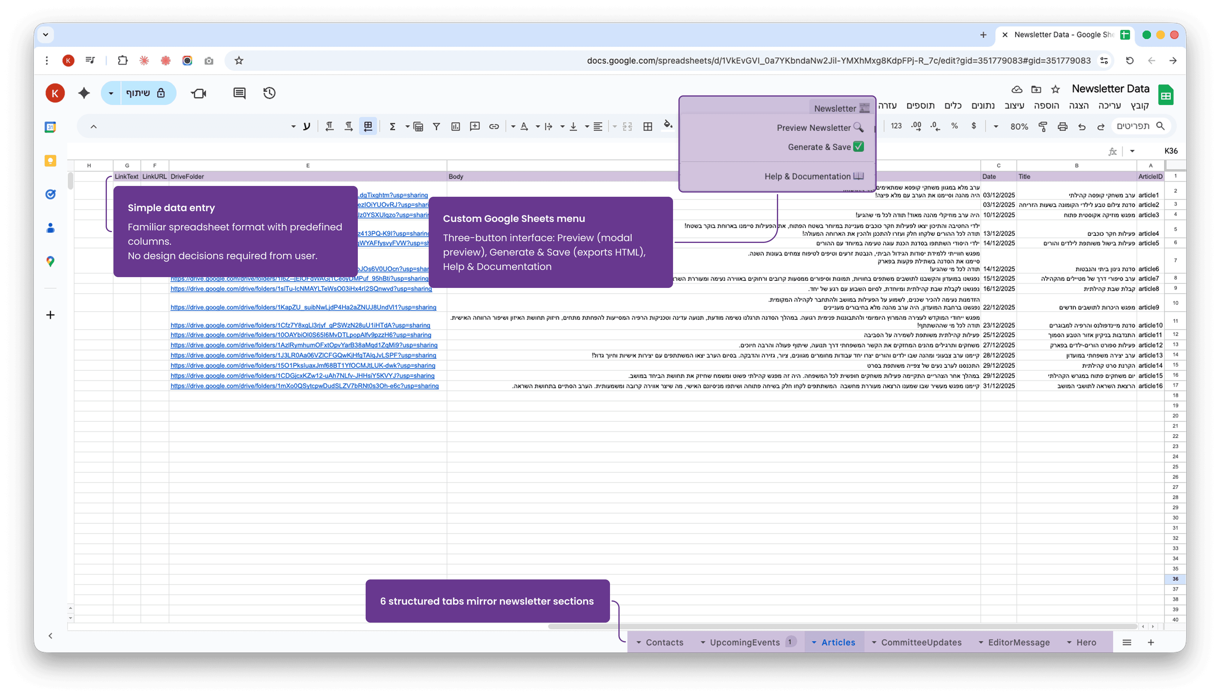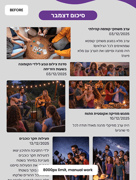 Segula, a small Israeli community, needed a monthly newsletter to centralize information about youth activities, senior programs, committee updates, and community events. But the existing workflow was broken.